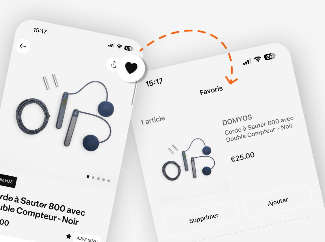 Ajoutez vos articles préférés dans vos “favoris” sur l’appli Decathlon et retrouvez-les en un geste pour vous faire plaisir quand vous voulez !