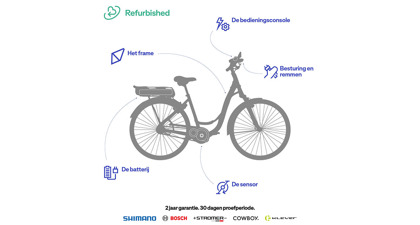 - Elke fiets wordt zorgvuldig gecontroleerd op meer dan 30 punten en opnieuw in topstaat gebracht door onze ervaren techniekers in ons reconditioneringscentrum in België.